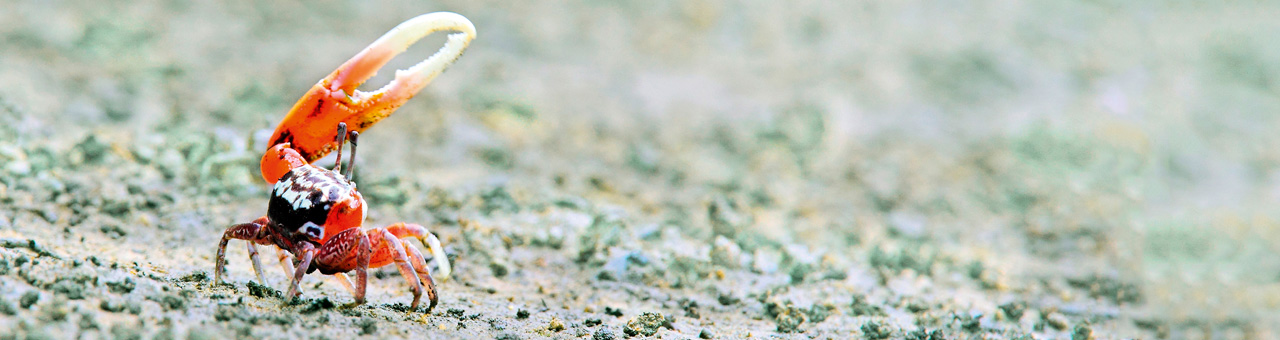 Crustaceans communicate through vibration. During nocturnal courtship, the male sand fiddler crab uses its oversized claw to drum on the ground luring his mate into his burrow.