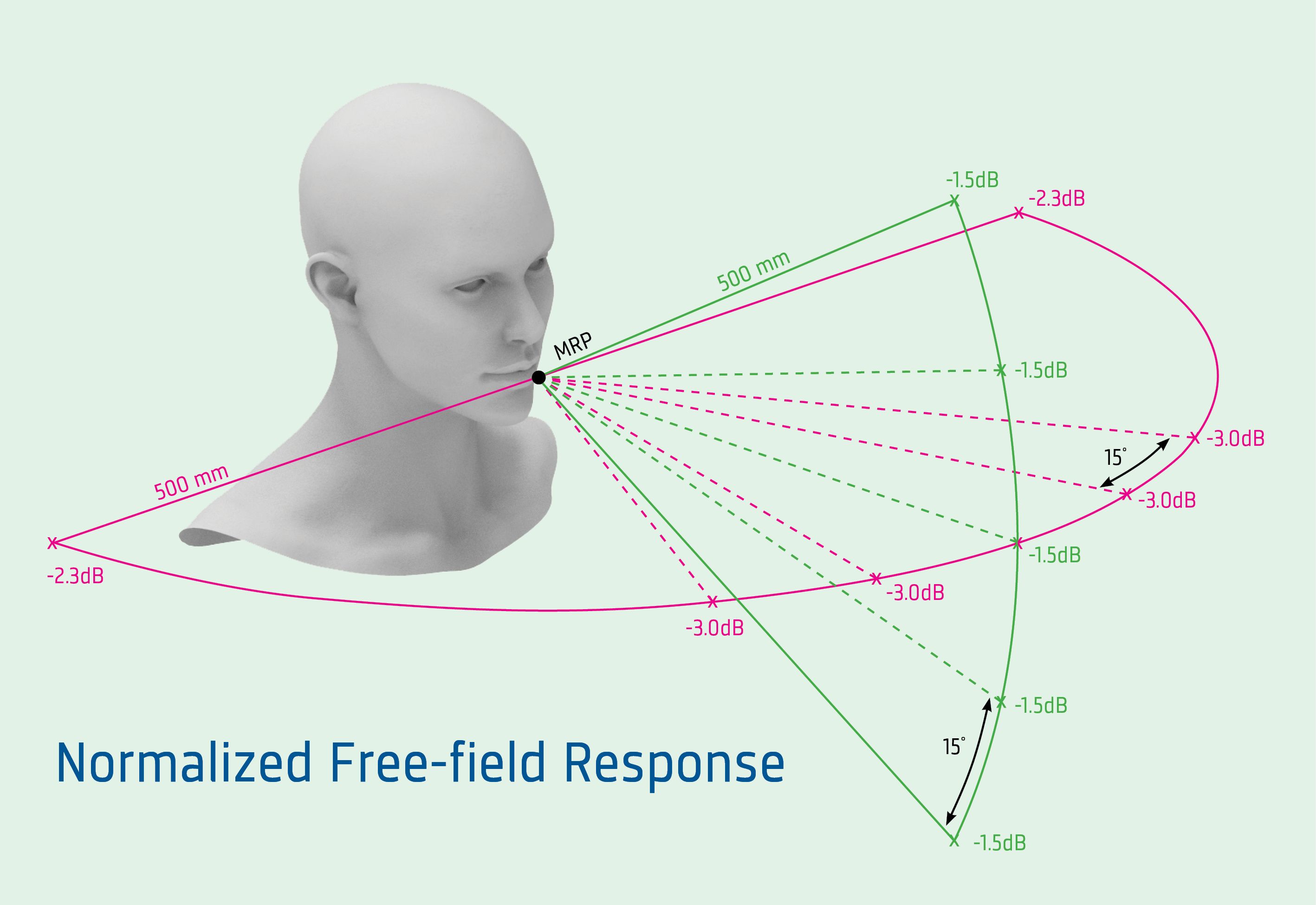 *A position 25mm in front of the Lip Reference Plane (LRP) and defined in terms of dB attenuation relative to 65.3dB SPL at a distance of 500 mm in front of the MRP or 89.3 dB SPL at the MRP. Points are located on a circle centred at MRP and distributed in the horizontal plane at 0°, ±15°, ±30° and ±90° as well as in the vertical plane at ±15° and ±30°.