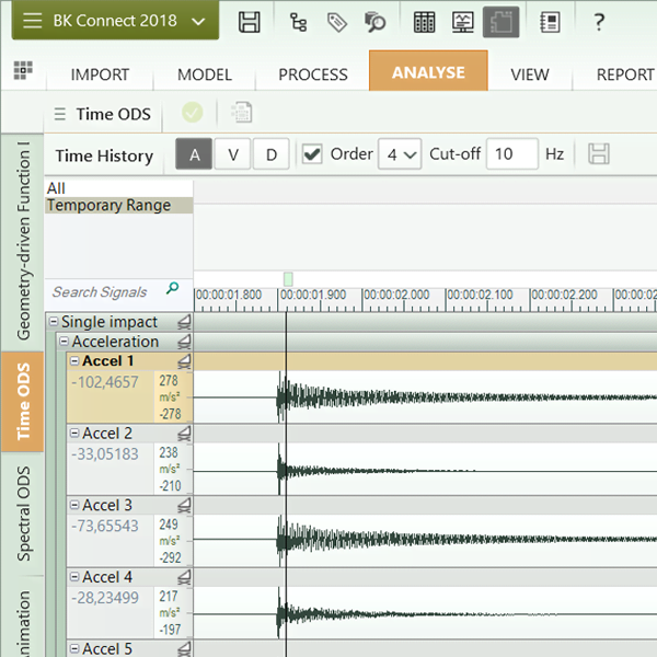 For an integrated, easy-to-use modal test and analysis system, use BK Connect® Time Data Recorder for geometry-guided data acquisition, and then transfer data to PULSE Operational Modal Analysis software for analysis and validation.