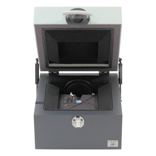 A configuração de medição típica para o teste de aparelhos auditivos utiliza um simulador de ouvido (acoplador) e uma caixa de teste anecóica. Uma caixa de teste anecóica proporciona um excelente isolamento do ruído externo, mesmo a baixas frequências, e condições de teste uniformes e bem definidas, que são requisitos importantes para a obtenção de medições exactas e repetíveis para medições fundamentais, tais como características de entrada/saída, geração de ruído interno e deteção de fugas. Por sua vez, o acoplador permite uma montagem fácil e medições precisas numa vasta gama de aparelhos auditivos. As medições são geridas e os dados analisados no nosso software de testes electroacústicos PULSE tipo 7907.